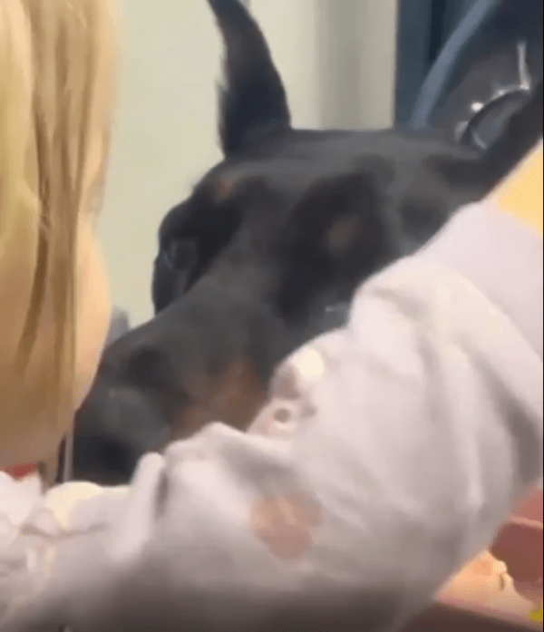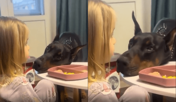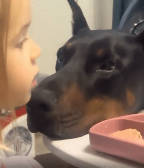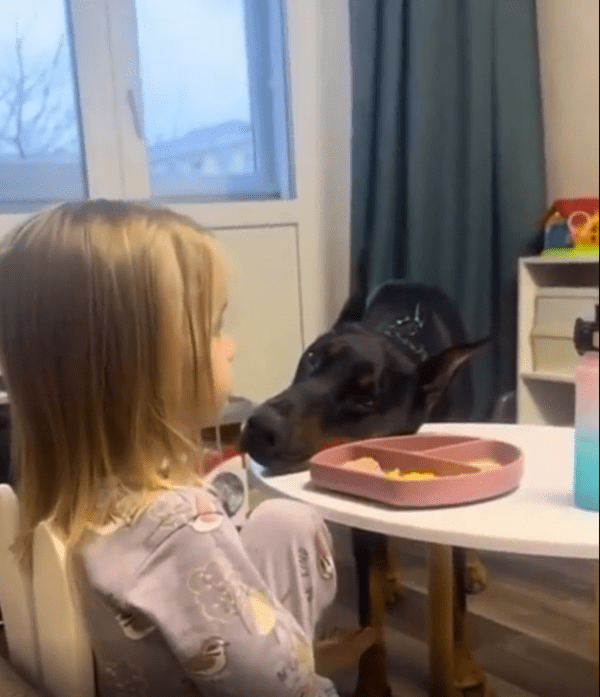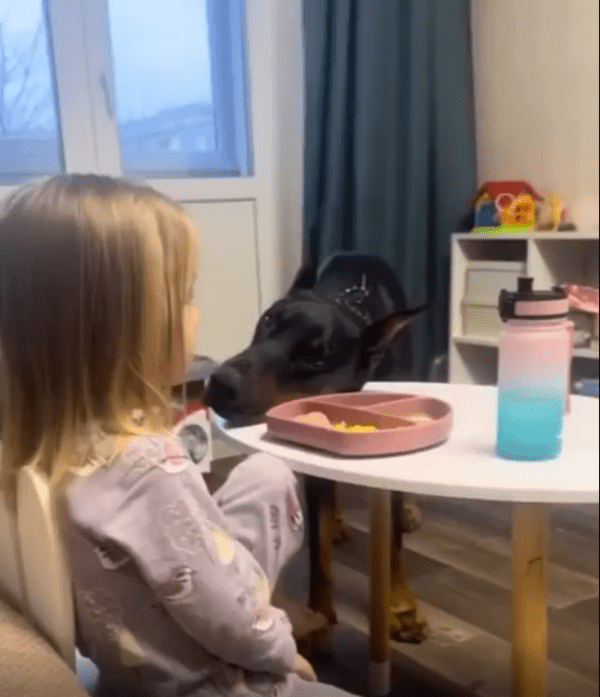 식탁 위에서 소녀가 밥을 먹고 있습니다. 그런데 바로 옆에서 한 마리의 강아지가 턱을 식탁에 살짝 대고 조용히 바라보고 있습니다. 아무런 소리도 내지 않고, 앞발을 들지도 않지만, 그 눈빛 하나만큼은 너무나 강렬합니다.