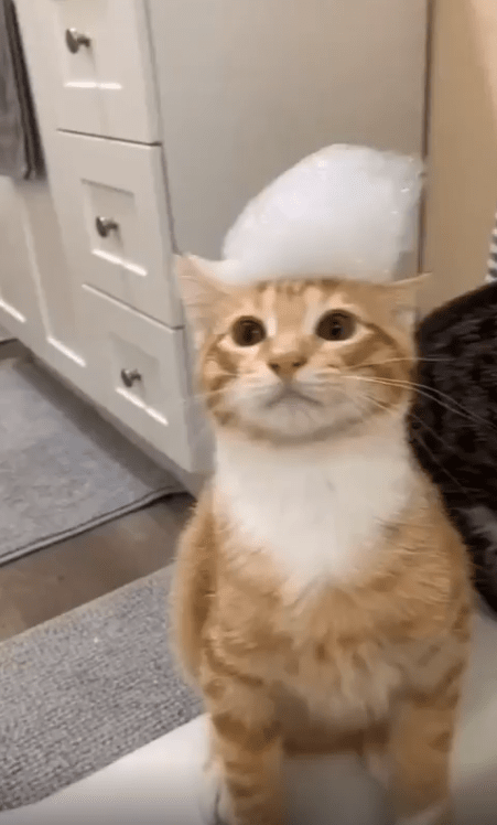출처 : Reddit / 귀여운 고양이 한마리 머리위에 거품이 묻어있다