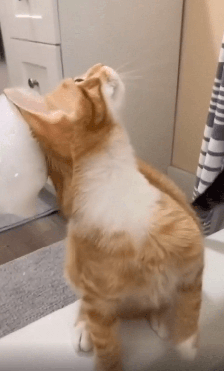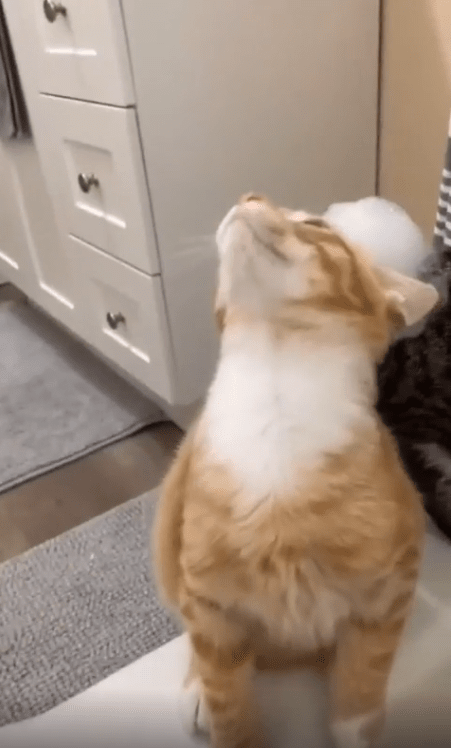 그러나 고양이는 끝내 머리 위의 비누 거품을 확인하지 못합니다. 계속해서 고개를 돌려보지만, 정작 자기 머리 위를 직접 볼 수는 없기 때문입니다. "뭔지는 모르겠지만… 기분이 묘하네?" 하는 듯한 혼란스러운 순간이 이어집니다.