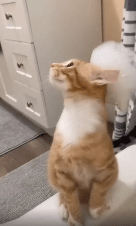 고양이는 다시 고개를 이쪽저쪽으로 움직이며 주변을 살핍니다. 혹시 무언가가 스쳐 지나갔나 싶어 뒤를 돌아보기도 합니다. 하지만 아무것도 보이지 않습니다. "어디서 오는 감각이지? 머리 위에 뭐라도 있는 거야?" 라는 듯한 태도입니다.