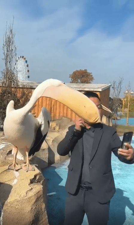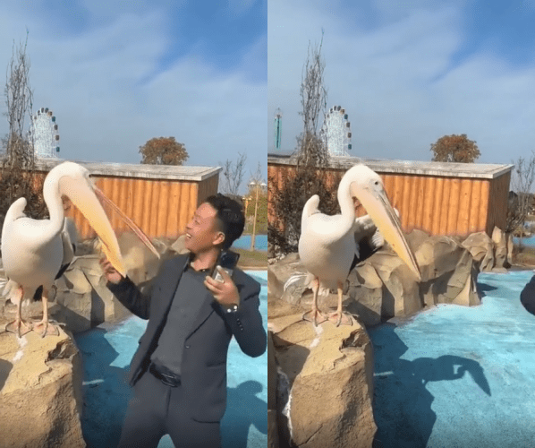 하지만 다음 순간, 예상치 못한 일이 벌어집니다. 펠리컨이 갑자기 부리를 활짝 벌리더니 남성의 얼굴을 덮어버리려는 듯 앞으로 다가옵니다. 마치 한입에 삼키려는 듯한 동작이지만, 실제로는 얼굴을 완전히 감싸지 못하고 그저 부리를 얼굴에 대는 것처럼 보입니다.