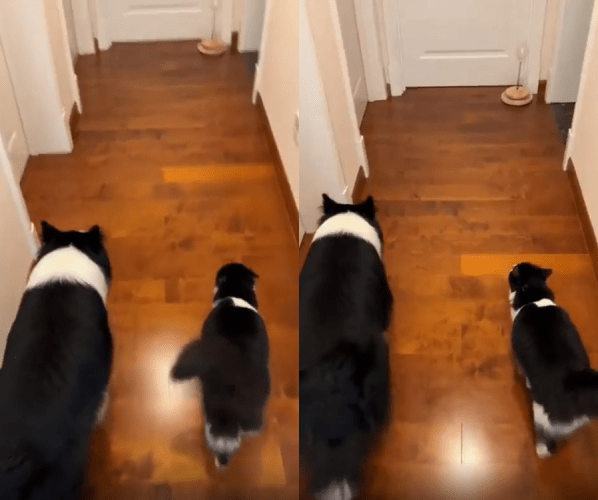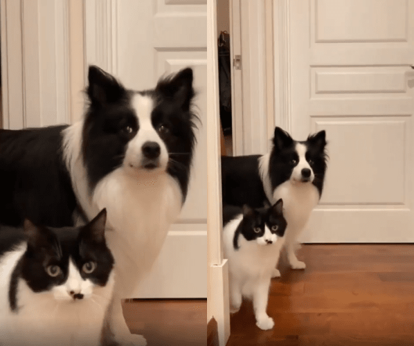 한눈에 보기에도 특이한 한 쌍이 있습니다. 검은색과 흰색의 독특한 패턴을 가진 강아지와 고양이가 나란히 있습니다. 그런데 단순히 털 색깔만 비슷한 것이 아닙니다. 둘은 마치 거울을 보는 것처럼 행동마저도 비슷하게 움직입니다.
