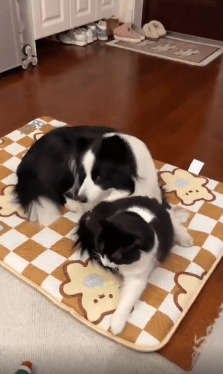 고양이가 몸을 돌리면 강아지도 따라 돌고, 강아지가 앉으면 고양이도 같은 자세를 취합니다. 마치 서로를 의식하며 행동을 맞추는 것처럼 보입니다. "우리는 팀이야!" 라는 듯한 모습이 사랑스럽습니다.