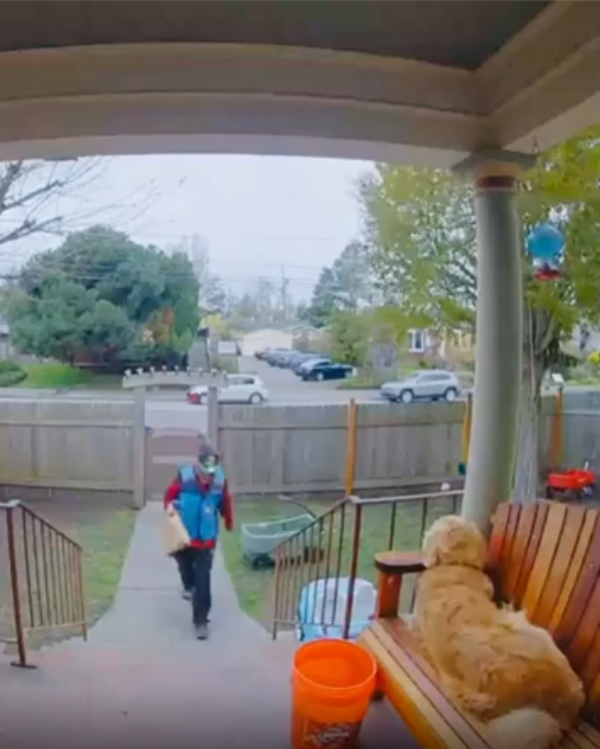 그러던 중, 배달 기사가 배달 물건을 들고 다가옵니다. 보통 개들은 낯선 사람이 가까이 오면 경계를 하거나 짖기 마련인데, 이 개의 반응은 예상과 전혀 다릅니다.