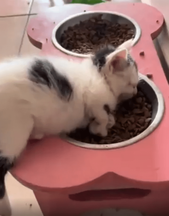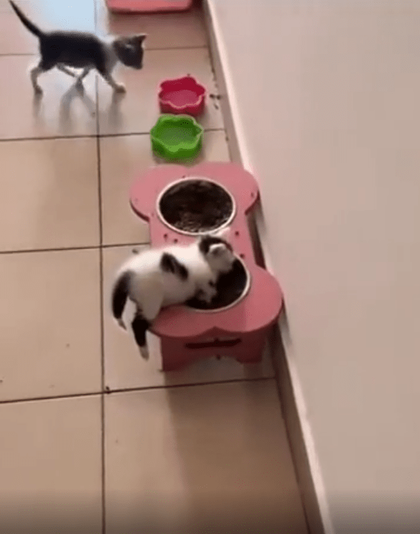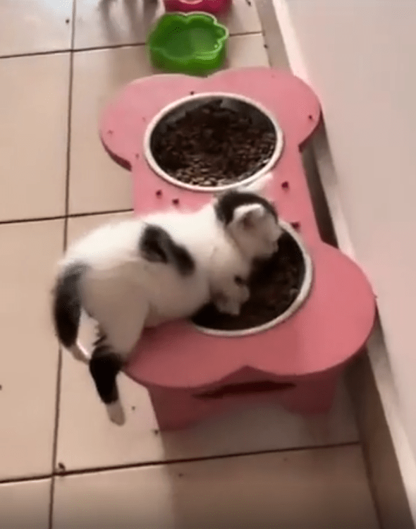 사료 그릇 위에 작은 새끼 고양이 한 마리가 올라가 있습니다. 그런데 자세가 이상합니다. 보통 사료를 먹으려고 올라가 있을 법한데, 이 고양이는 그 위에서 그대로 잠들어버렸습니다.