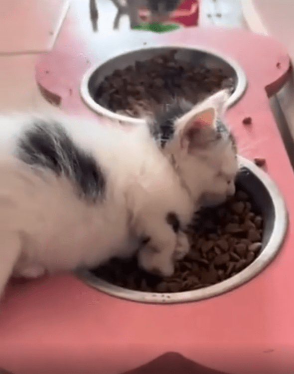 배불리 먹고 기절?! 사료 그릇 위에서 잠든 새끼 고양이