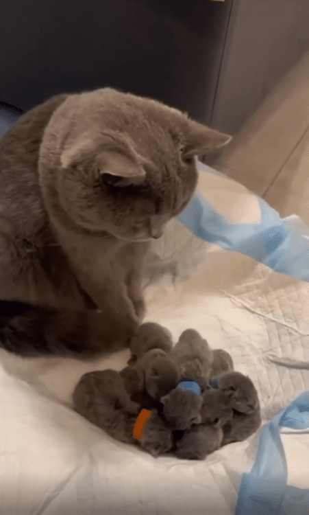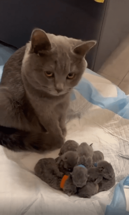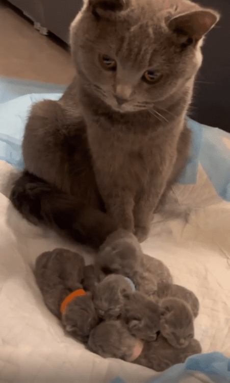 어미 고양이가 여러 마리의 새끼 고양이 앞에 서 있습니다. 하지만 평소처럼 보살피거나 놀아주는 모습은 아닙니다. 어딘가 멍하니 먼 곳을 응시한 채, 깊은 생각에 잠긴 듯한 표정.