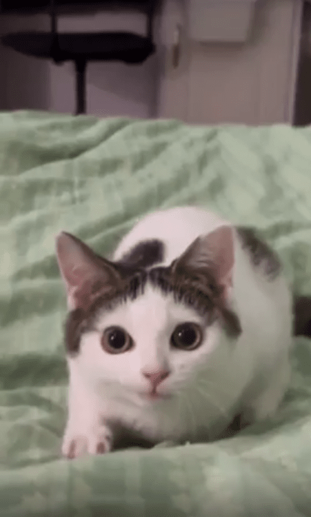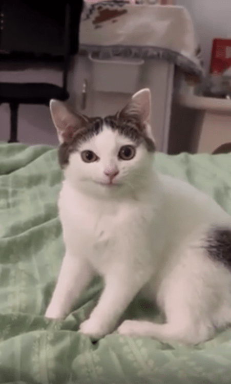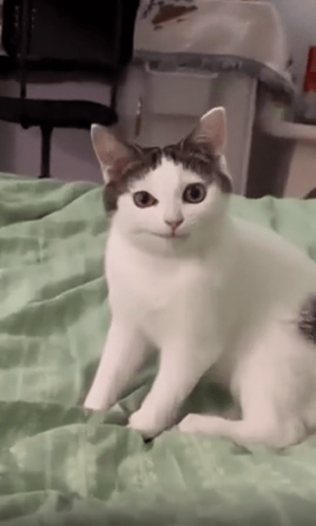 출처 : Reddit / 침대위의 고양이가 묘한 표정으로 있다
