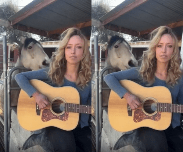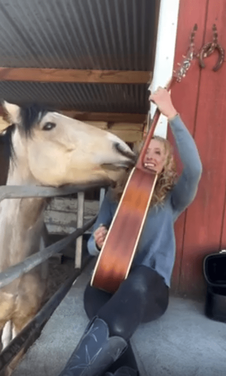 하지만 여기서 끝이 아닙니다. 여성이 기타를 연주하기 시작하자, 말은 더욱 신난 듯 리듬을 타기 시작합니다. 기타 소리에 맞춰 자연스럽게 고개를 흔드는 모습. 마치 무대 위에서 음악을 즐기는 록스타처럼 보입니다.