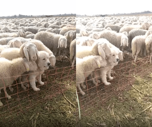 몸 색깔까지 비슷해서 한눈에 알아차리기 쉽지 않습니다. "이 중에 하나는 양이 아닙니다…" 라는 말이 절로 떠오를 정도. 하지만 개는 특별한 행동을 하지 않고, 마치 양처럼 조용히 서 있습니다.