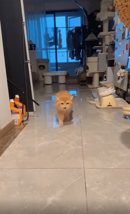 멀리 복도 끝에서 한 마리의 고양이가 모습을 드러냈습니다. 주변을 둘러보던 눈빛은 곧 주인을 향했고, 그 순간부터 울음소리는 점점 더 커졌습니다.