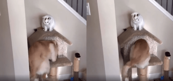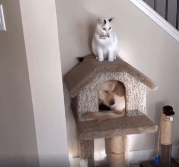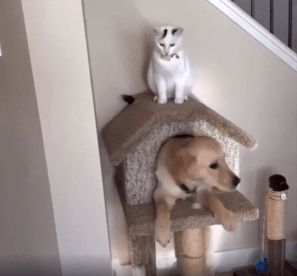 이 둘의 관계가 앞으로 어떻게 될지는 알 수 없지만, 지금 이 순간만큼은 강아지가 고양이 집의 새로운 세입자로 당당하게 자리 잡은 것 같습니다. 결국 고양이는 이 상황을 받아들일까요, 아니면 나중에 조용히 반격을 준비할까요?