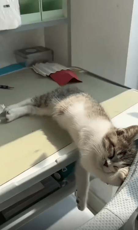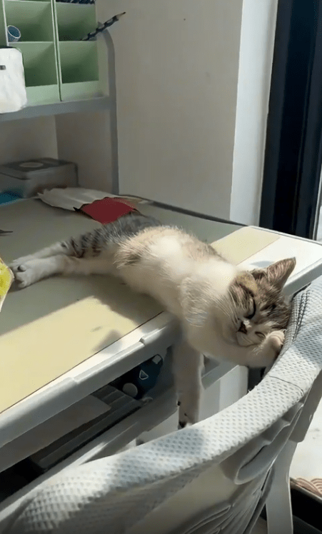 고양이들은 예상치 못한 곳에서 편안한 자세를 찾아내는 능력이 뛰어납니다. 어떤 때는 작은 상자 안에서, 또 어떤 때는 높은 선반 위에서, 그리고 이 고양이처럼 책상과 의자를 활용해 새로운 휴식 공간을 만들기도 합니다.