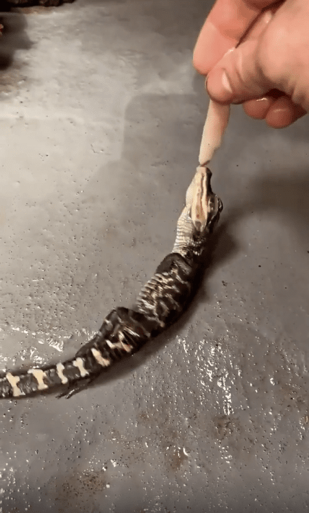 사람 손 위에 작은 새끼 악어가 있었습니다. 크기는 손가락만 한데도, 눈빛만큼은 강렬했습니다. 그리고 그 앞에 먹이가 가까이 다가오자, 새끼 악어는 망설임 없이 입을 벌려 덥석 물었습니다.