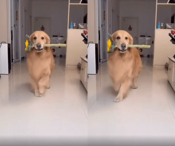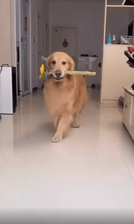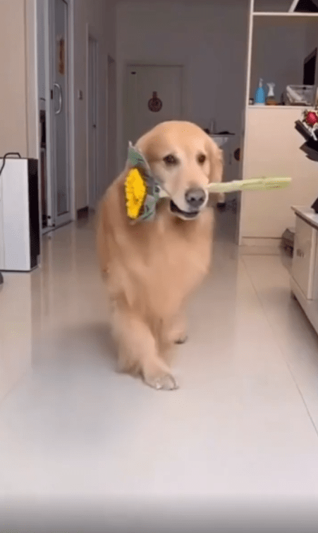 출처 : Reddit / 꽃을 입에 물고 걸어오는 개