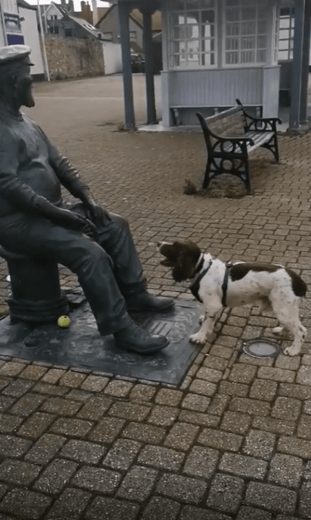동상 앞에서 한참을 기다리는 강아지, “공 던져줄 거죠?”