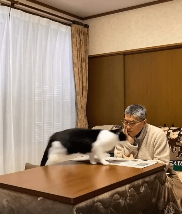그러다 갑자기 신문 밑으로 파고들어갔습니다. 남자가 들고 있던 신문이 불쑥 들리면서 균형이 흐트러졌고, 그는 신문을 다시 바로잡으려 애썼습니다. 하지만 고양이는 아랑곳하지 않고 계속 신문 사이를 드나들며 방해를 이어갔습니다.