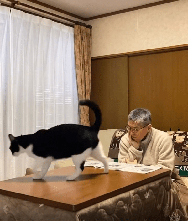 한 남자가 좌식 테이블에 앉아 신문을 읽고 있었습니다. 조용한 분위기 속에서 차분한 아침을 보내려는 듯 보였지만, 그 평온함은 오래가지 않았습니다.