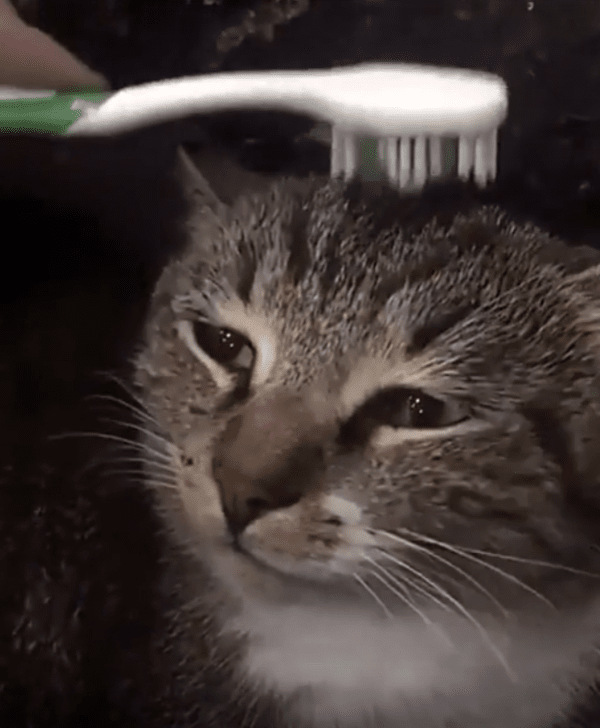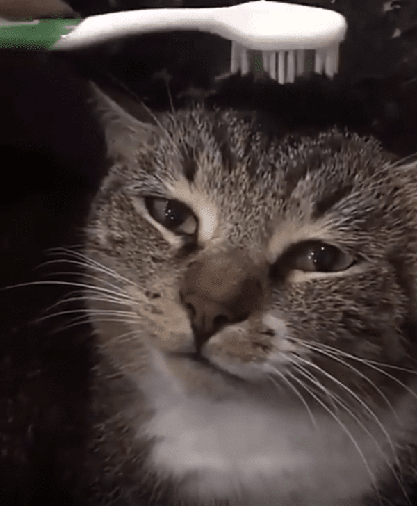 한 손에 쥔 젖은 칫솔이 고양이의 머리 위를 부드럽게 스쳤습니다. 놀랍게도 고양이는 순식간에 편안한 표정으로 변해 눈을 살짝 감으며 그 감촉을 온몸으로 느끼기 시작했습니다.