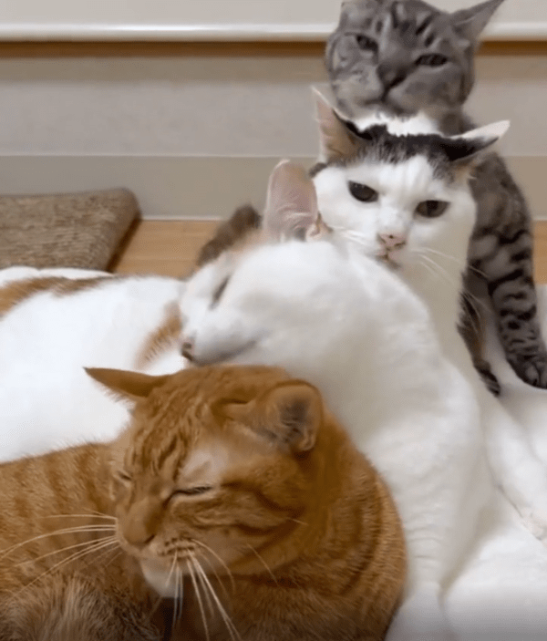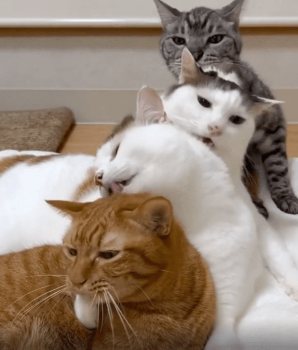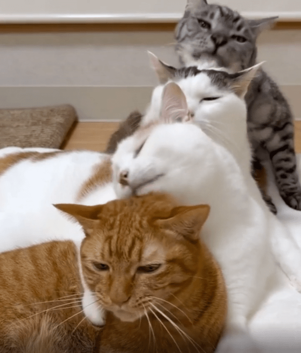 네 마리의 고양이가 일렬로 나란히 앉아 있는 모습은 그 자체로도 귀엽고 정돈된 느낌을 주었습니다. 하지만 이 영상의 진짜 하이라이트는 바로 앞고양이의 머리를 차례차례 정성스럽게 그루밍해주는 모습이었습니다.