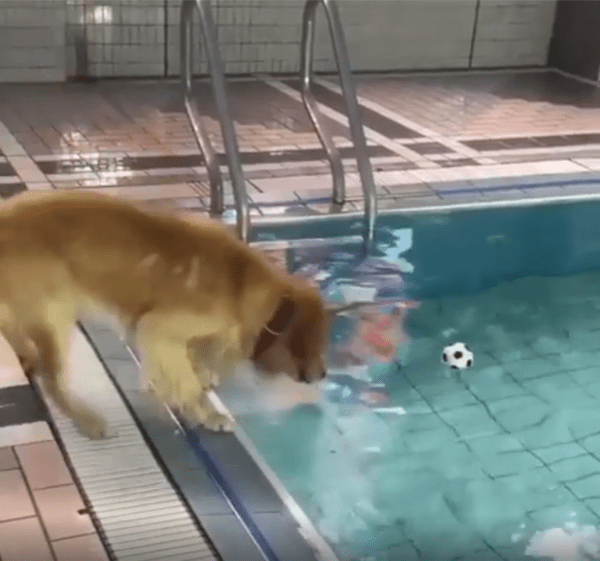 맑은 물이 가득 찬 수영장, 그 한쪽에 작은 공 하나가 조용히 떠 있었습니다. 그리고 그 공을 바라보는 골든 리트리버의 시선은 "꼭 주워야 해!" 라는 결연한 의지로 가득 차 있었습니다.