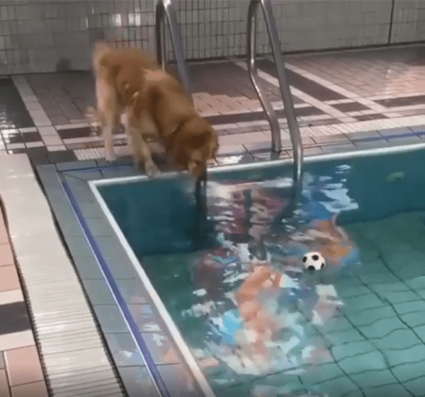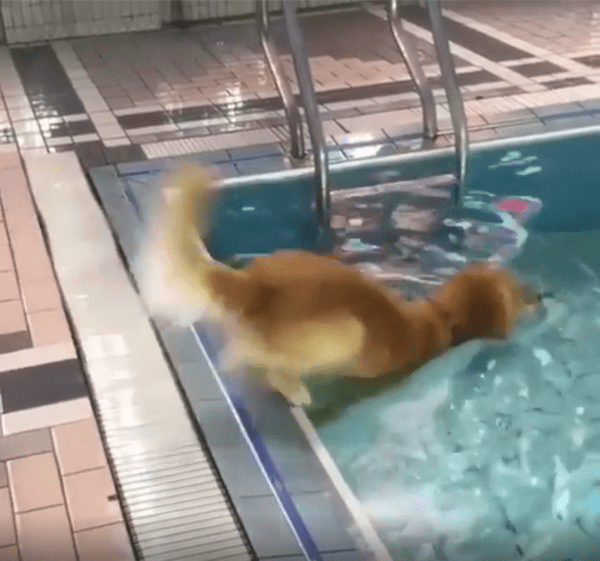 하지만 공은 생각보다 가까운 듯하면서도 결정적인 한 끗 차이로 멀리 있었습니다. 앞발로 균형을 잡으며 버텨보려 했지만, 몸의 무게 중심이 점점 앞으로 쏠렸고 결국 "풍덩!" 하는 소리와 함께 수영장에 빠지면서도 공을 입으로 정확히 집어냈습니다.