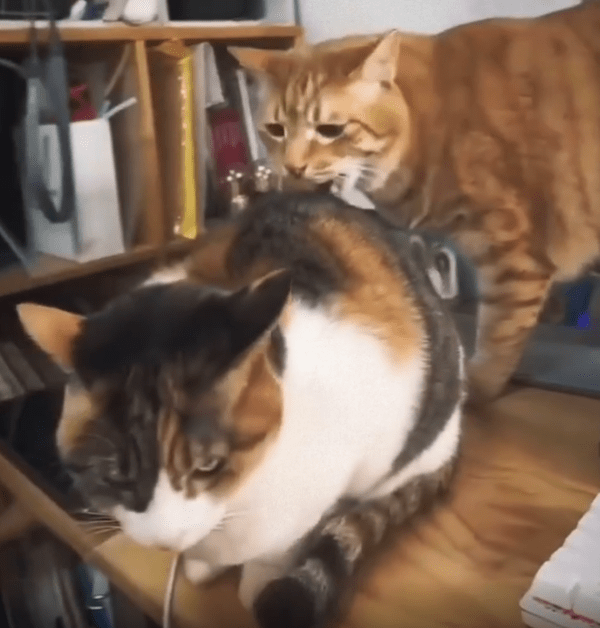 뒤쪽 고양이는 순간 당황한 듯 멈칫했지만, 어쩌면 속으로 이렇게 생각하고 있었을지도 모릅니다.
