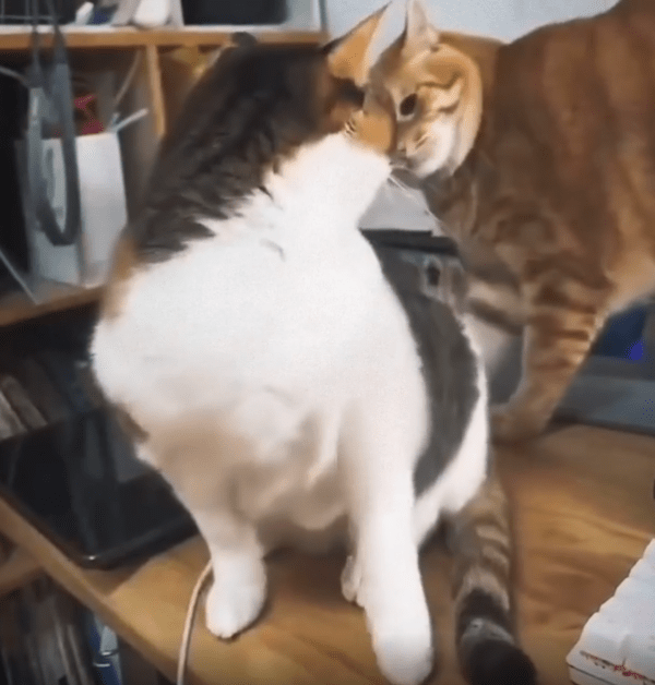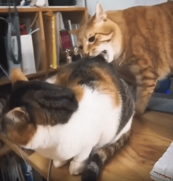그러나 뒤쪽 고양이는 망설이지 않았습니다. 앞쪽 고양이가 계속 눈치를 줬지만, 마치 “그래도 한 번쯤은 괜찮지 않을까?” 하는 듯 태연하게 다시 접근했습니다. 그리고 순간, 엉덩이를 향해 입을 벌리고 한 번 더 시도!