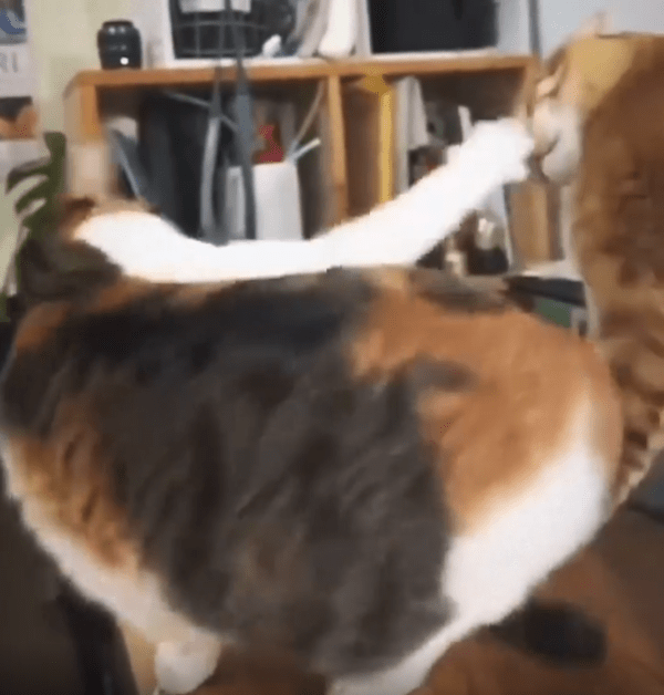 출처 : Reddit / 몇번 시도를 계속하자 앞의 고양이가 결국 못참고 펀치를 날린다