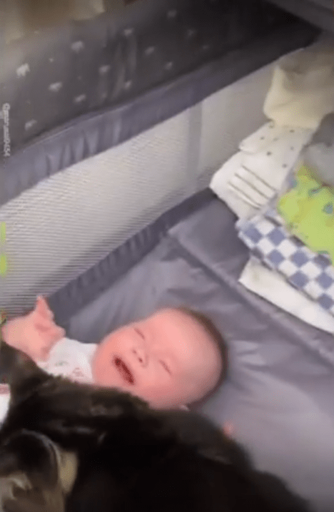 고양이 한 마리가 유아용 침대 근처에서 조용히 상황을 지켜보고 있었습니다. 침대에서는 아기의 울음소리가 들려왔고, 고양이는 마치 그 소리에 반응하듯 천천히 움직였습니다.