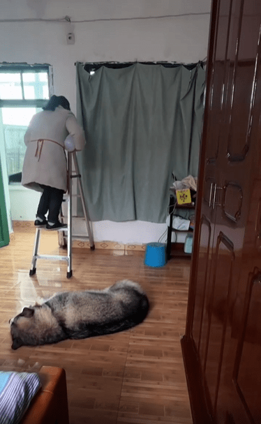 거실 한편, 여자 주인이 벽 쪽에 사다리를 세웁니다. 교체해야 할 등이 천장 높이에 달려 있는 탓에, 주인은 조심스럽게 사다리를 오르기 시작합니다. 주변은 조용하고, 작은 긴장감이 흐릅니다. 그 모습을 거실 바닥에 누워 바라보고 있던 강아지가 있었습니다.