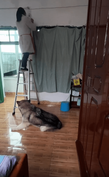강아지는 처음엔 고개를 살짝 기울이며 주인의 움직임을 조용히 지켜봅니다. 하지만 주인이 사다리를 올라서고, 몸을 뻗어 천장 쪽 등을 만지려는 순간, 강아지는 벌떡 몸을 일으킵니다.