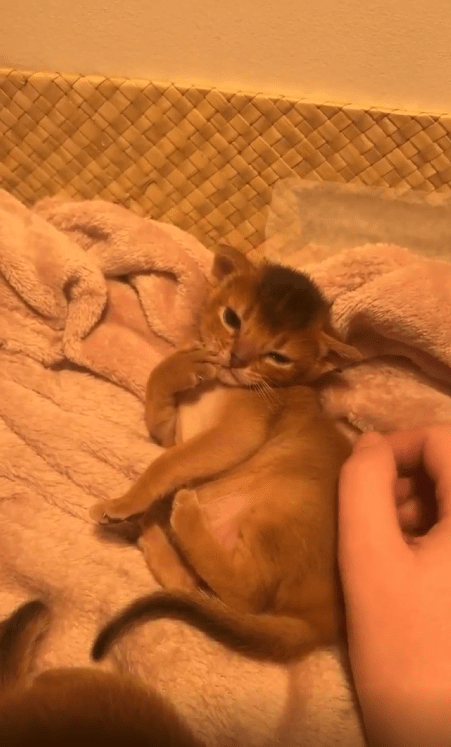 주인의 손이 천천히 등을 쓰다듬자, 아기 고양이는 마치 이 순간을 즐기기라도 하듯 몸을 살짝 늘어뜨립니다. 그리고는 놀랍게도 앞발을 조심스럽게 입 가까이로 가져가며 아주 우아한 포즈를 취합니다. 마치 "나 예쁘지?"라고 말하는 듯한 완벽한 자세입니다. 부끄러운 듯하지만 자신감도 넘치는 이 모습이 너무 사랑스럽습니다.