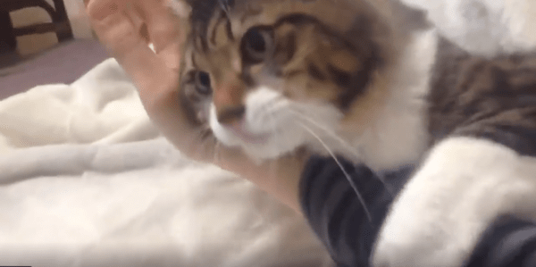 고양이가 집사의 팔을 붙잡으려 합니다. 가볍게 앞발을 뻗어 팔을 끌어당기고, 마치 "여기 좀 가만히 있어 봐."라고 말하는 듯한 태도입니다. 처음에는 그냥 손을 대는 정도였지만, 점점 더 적극적으로 팔을 감싸 안으려 합니다.