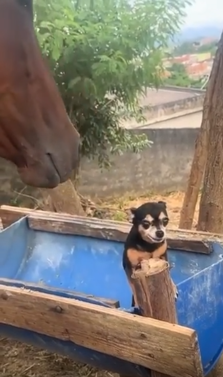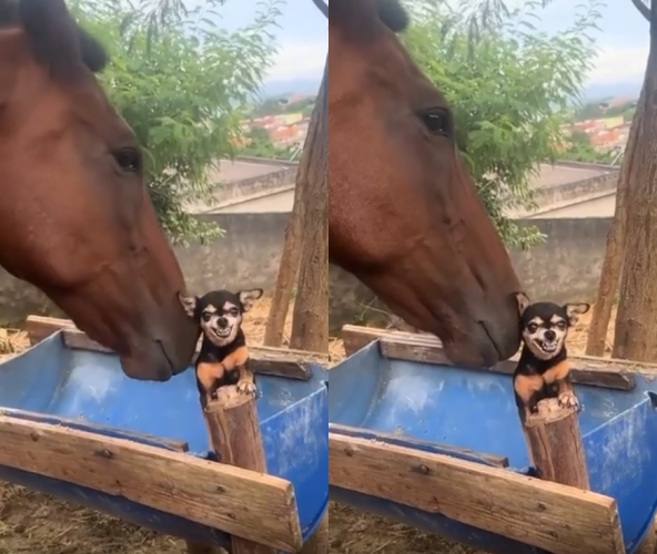 사실 강아지들은 몸집과 상관없이 자신이 지켜야 할 영역이나 불편한 상황이 오면 본능적으로 으르렁거리며 경고하는 행동을 보입니다. 이 작은 강아지도 거대한 말의 접근이 당황스러웠던 것 같지만, 그럼에도 용감하게 자신의 입장을 표명하는 모습이 인상적입니다.