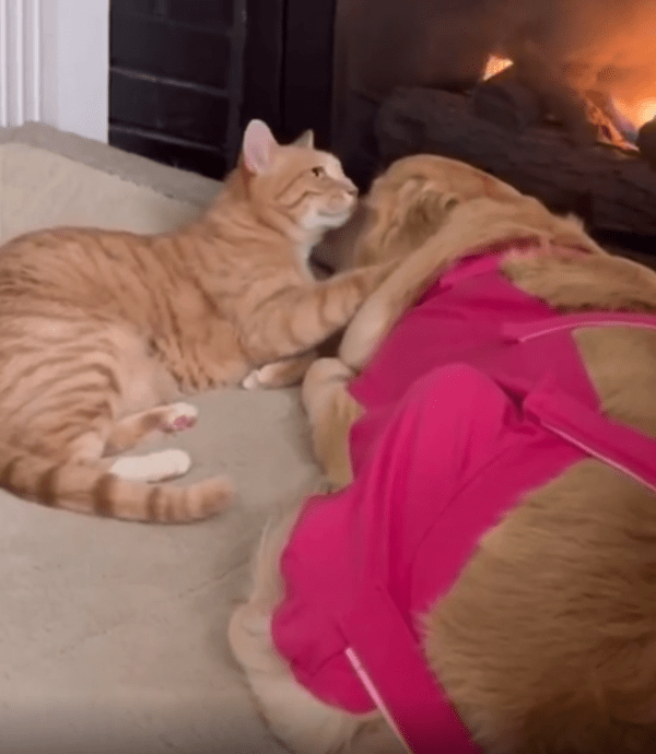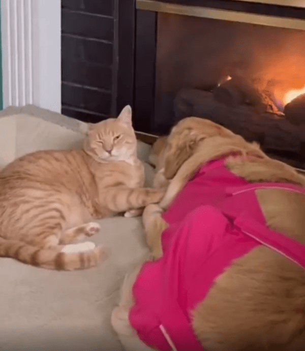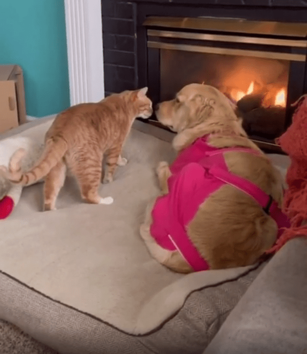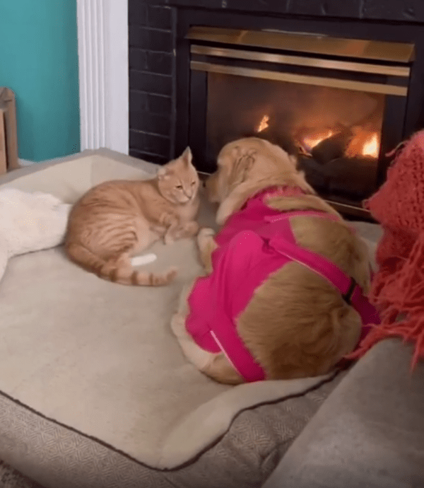 사실 동물들도 서로에 대한 깊은 유대감과 감정을 느낍니다. 단순히 함께 사는 존재가 아니라, 서로의 상태를 이해하고 위로해 줄 줄 아는 경우가 많습니다. 이 고양이도 강아지가 힘들어하는 순간에 자연스럽게 다가가 따뜻한 위로를 전하고 있는 것입니다. 특히 난로 옆에서 서로의 온기를 나누는 모습은 마치 추운 날 서로에게 의지하며 따뜻함을 찾는 친구의 모습과 같습니다.