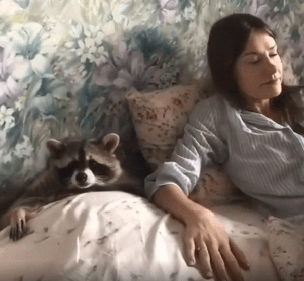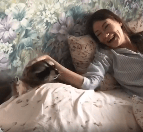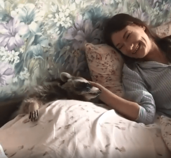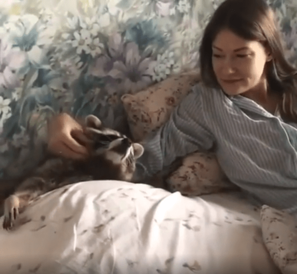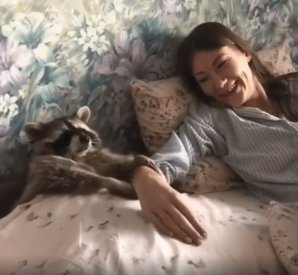 침대 위에서 라쿤과 여주인이 나란히 누워 있습니다. 라쿤은 포근하게 이불까지 덮고 있는 상태입니다. 여주인이 라쿤의 목덜미를 부드럽게 긁어주고 있습니다. 라쿤은 눈을 감고 편안한 표정을 짓습니다.