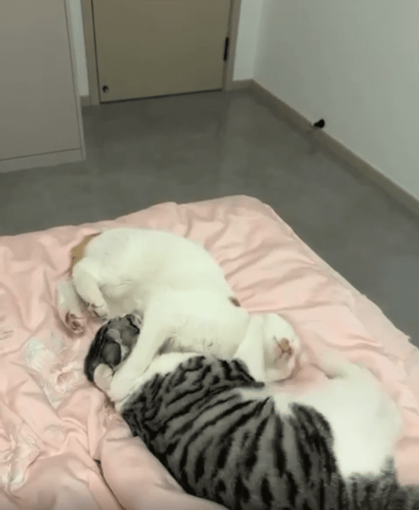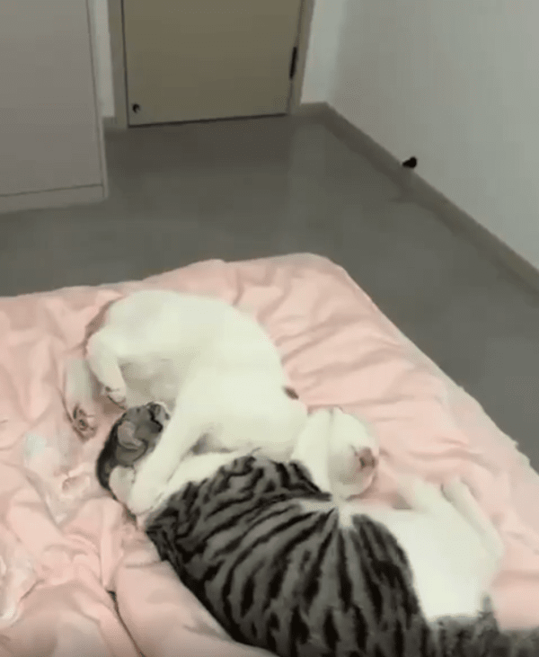 두 마리의 고양이가 서로의 몸을 감싸 안고 있습니다. 마치 서로를 꼭 껴안은 듯한 자세입니다. 그런데 흥미로운 것은 고양이들이 교차로 껴안은 상태에서 서로의 머리를 뒷발로 긁어주고 있다는 점입니다. 한 고양이가 먼저 상대방의 머리를 살살 긁어주면, 다른 고양이도 곧바로 반응하며 상대의 머리를 긁어줍니다. 마치 "나도 해줄게!"라고 말하는 듯한 모습이 너무 사랑스럽습니다.