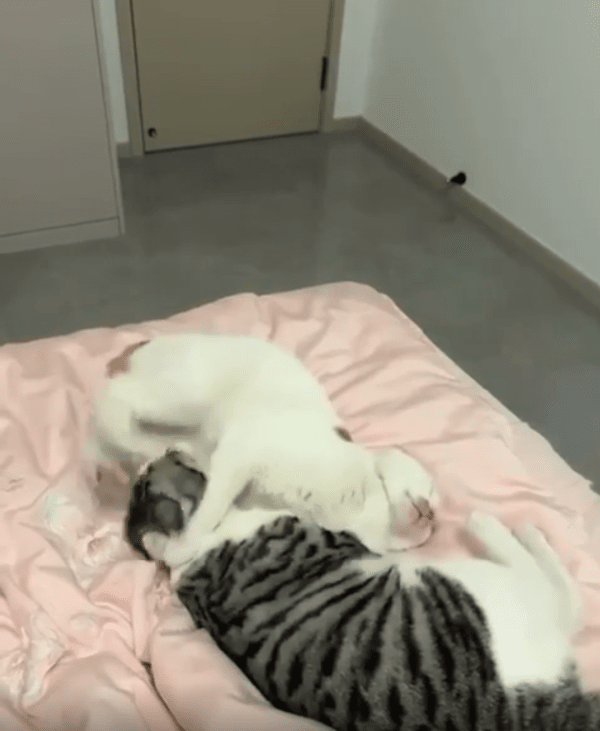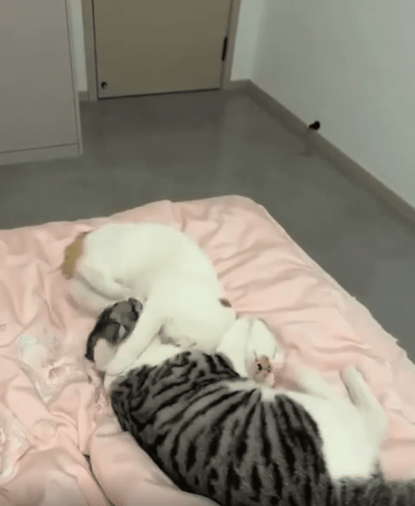 고양이들은 서로를 긁어주며 완벽한 호흡을 보여줍니다. 한 고양이가 머리를 긁기 시작하면 다른 고양이도 뒤따라 반응하며 마치 서로 보답이라도 하듯 다정하게 상대의 머리를 긁어줍니다. 서로를 향한 애정과 신뢰가 느껴지는 순간입니다. 고양이들은 그렇게 교차로 머리를 긁어주며 편안한 표정을 짓습니다.