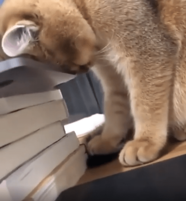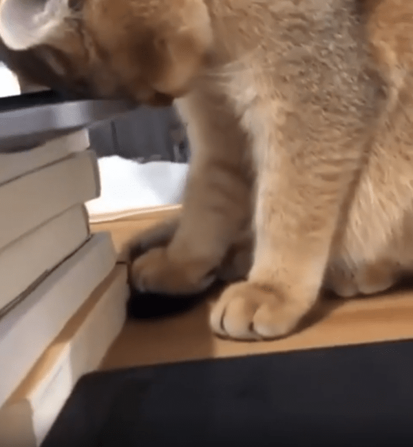 고양이가 책이 쌓인 위에 놓인 노트북 옆에서 조용히 자고 있습니다. 머리를 노트북에 살짝 기대고 있는 모습이 너무 귀엽습니다. 책이 쌓여 있는 탑은 약간 불안정해 보이지만, 고양이는 전혀 신경 쓰지 않고 편안한 자세로 꿀잠을 자고 있습니다. 마치 노트북의 온기가 고양이를 안정시키는 듯한 모습입니다.