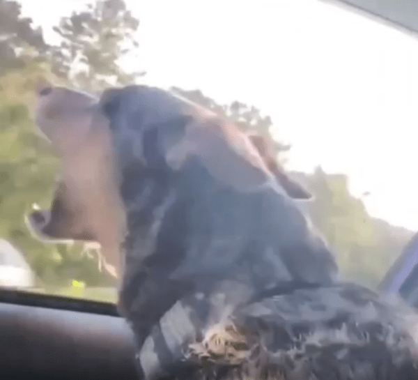 강아지가 달리는 차의 열린 창문에서 고개를 내밀고 밖을 바라보고 있습니다. 그러다 반대편에서 다른 차가 지나가는 순간, 강아지가 갑자기 입을 쩍 벌리고 그 차를 깨물 듯한 반응을 보입니다. 마치 상대 차를 향해 한 입 베어 물고 싶은 듯한 모습입니다.