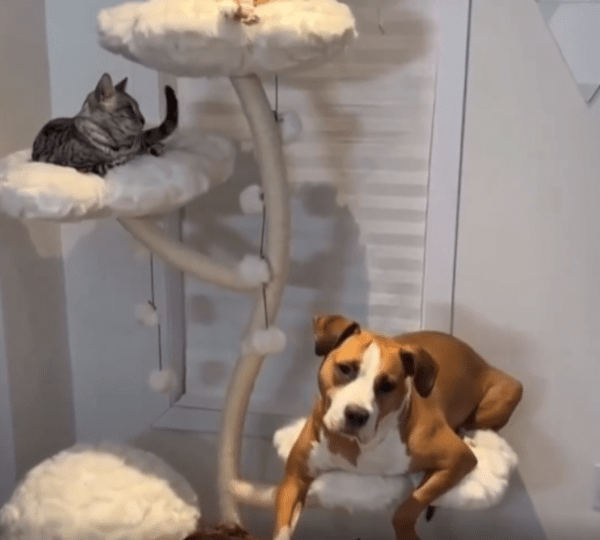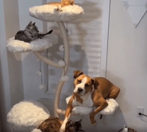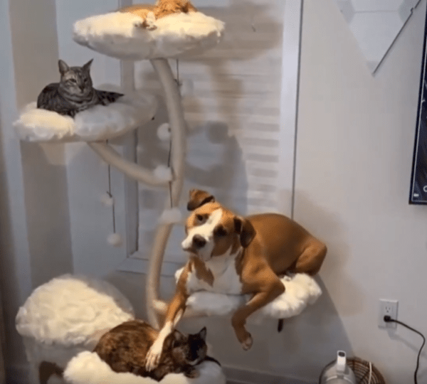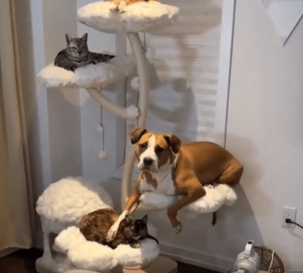 작은 방 안, 벽 한쪽에 놓인 캣타워 위에는 고양이들이 조용히 앉아 있습니다. 그런데 그들 사이에 뜻밖의 존재 하나가 나란히 앉아 있습니다. 바로 강아지입니다. 덩치는 고양이들보다 조금 크고, 몸에 붙는 단정한 털을 가진 강아지 한 마리. 어색할 법한 이 풍경 속에서, 강아지는 오히려 가장 자연스럽게 자리를 잡고 있습니다.