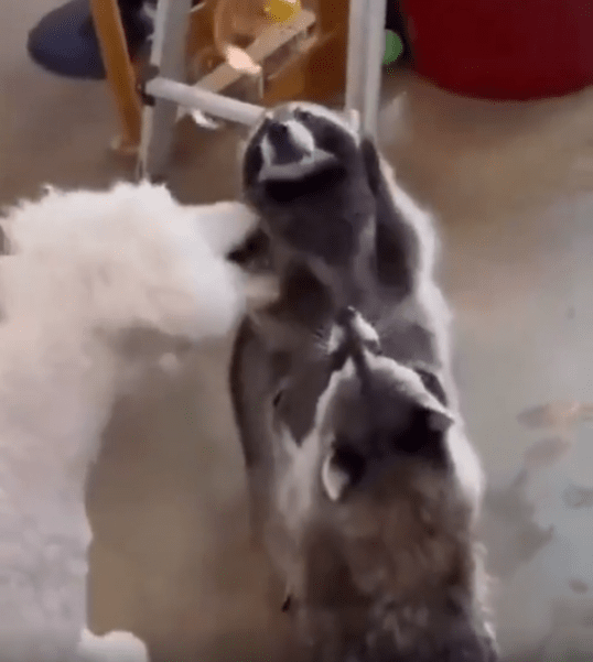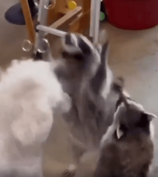 비누방울이 머리 위를 스치자, 한 마리가 앞발을 번쩍 들어 올리더니 허공을 향해 날렵하게 점프. 두 앞발로 비누방울을 정확히 툭 건드리며 산산이 터트려버립니다. 그리고 곧이어 옆에 있던 또 다른 너구리도 뛰어오르며 연달아 공격을 시도하죠. 장난감도 없고, 특별한 신호도 없었지만 둘의 행동은 마치 오래 전부터 계획된 팀플레이처럼 완벽하게 맞아떨어졌습니다. 너구리들의 점프는 높진 않았지만 정확했고, 앞발은 말 그대로 솜방망이처럼 부드럽게 날아드는 순간을 노리고 있었습니다.