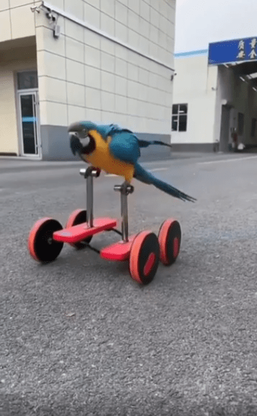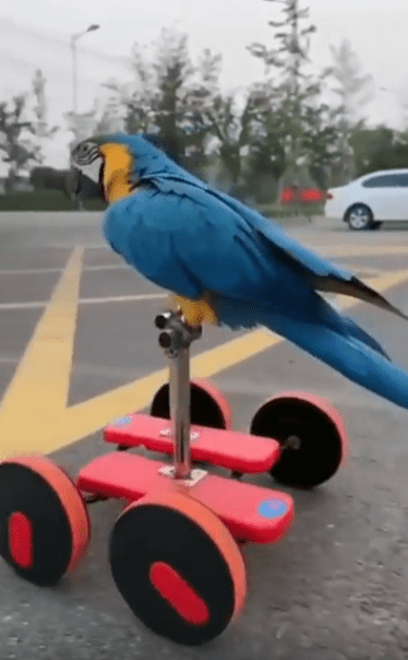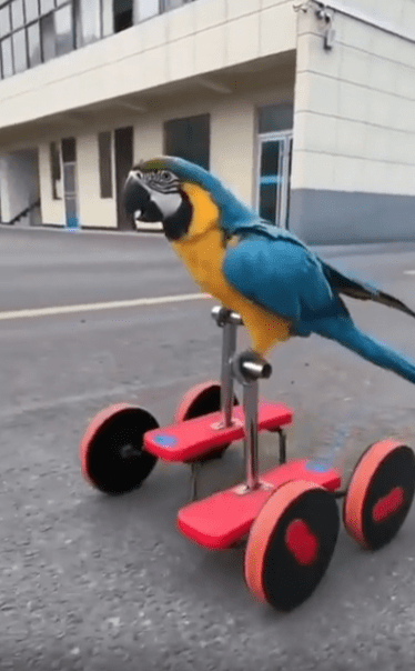 햇살이 비치는 야외 주차장, 시멘트 바닥 위에 작고 독특한 구조물이 하나 놓여 있습니다. 네 개의 작은 바퀴가 달린 프레임, 그 위에 페달이 양쪽으로 달려 있는 모습은 마치 자전거와 킥보드를 섞은 듯한 형태. 그런데 그 위에 올라탄 존재가 심상치 않습니다. 날개보다 다리가 더 바쁜, 바로 한 마리 앵무새입니다.