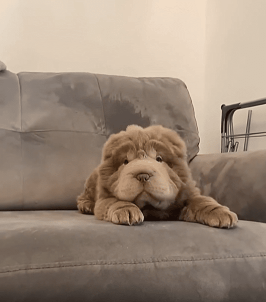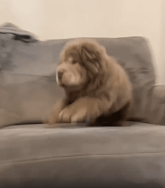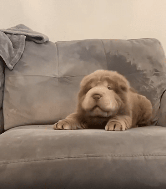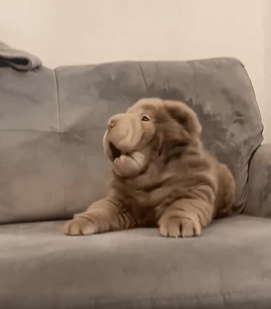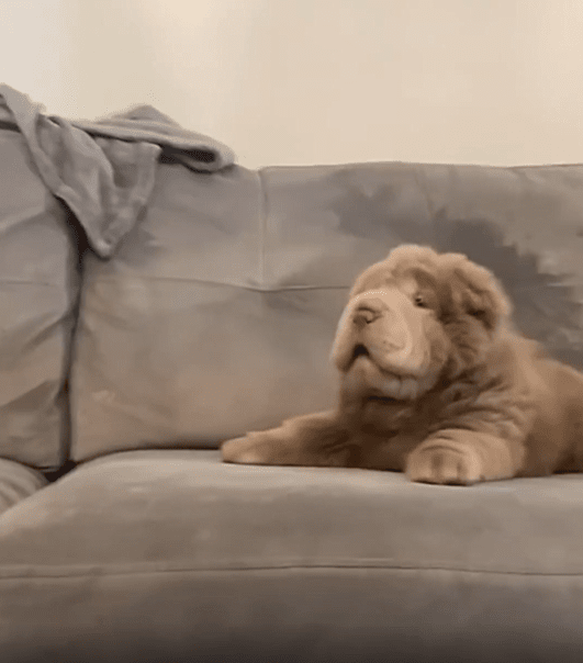 소년의 웃음소리가 한 번 더 들려오자, 이번엔 두 번 연속 짖습니다. 강아지는 여전히 소파에 누워 있지만, 완전히 깨어 있습니다. 귀는 웃음의 방향을 탐지하듯 움직이고, 짖음은 마치 “나 여기 있어!” 혹은 “또 웃었네?” 하고 반응하는 듯한 톤. 놀라거나 긴장했다기보다, 기다렸다는 듯 반갑고 익숙한 반응처럼 보입니다.