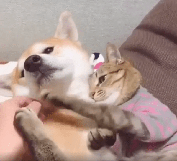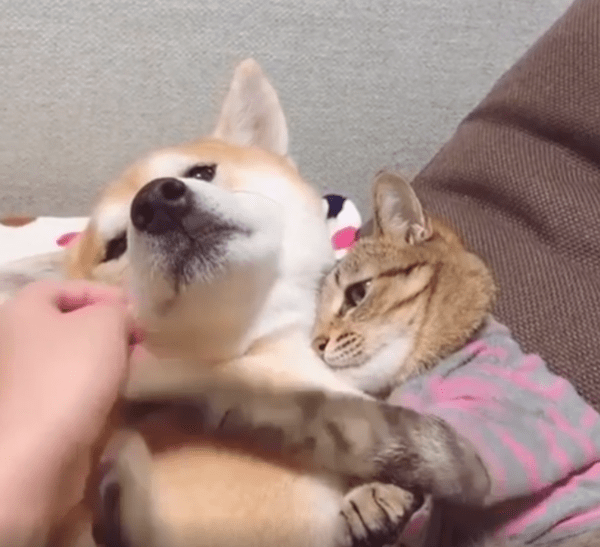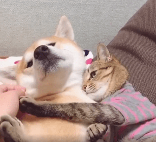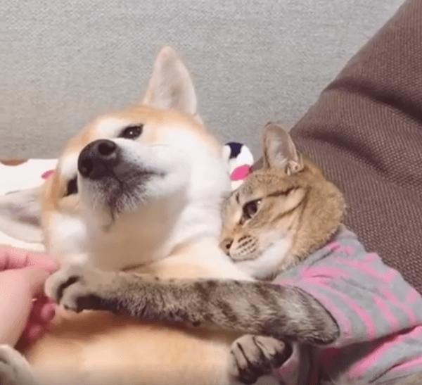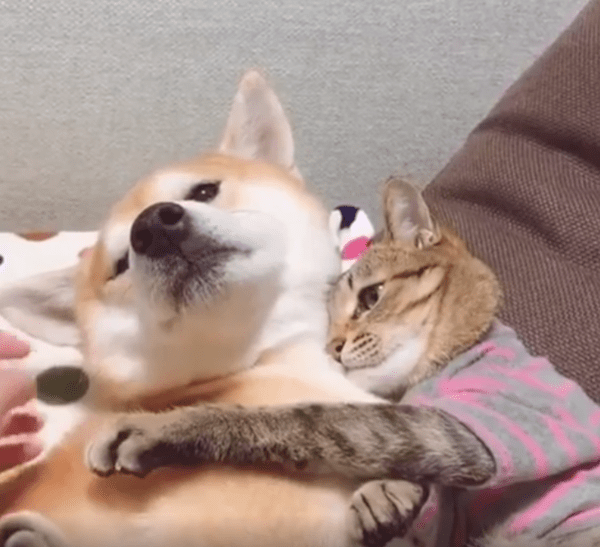 실내 한켠, 조용한 분위기 속에서 강아지 한 마리가 편안하게 앉아 있고, 그 옆에는 고양이 한 마리가 바짝 붙어 있습니다. 그런데 단순히 옆에 있는 게 아닙니다. 고양이는 강아지를 꼭 끌어안은 채, 턱은 강아지 어깨에 살짝 얹고, 두 앞발로는 상대를 품 안에 꾹 눌러 담고 있죠. 그 모습은 마치 "이건 내 동생이자 내 베개야"라고 선언하듯, 말 없는 소유권을 드러냅니다.