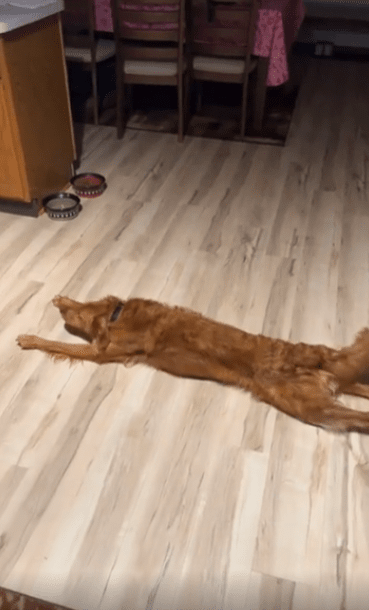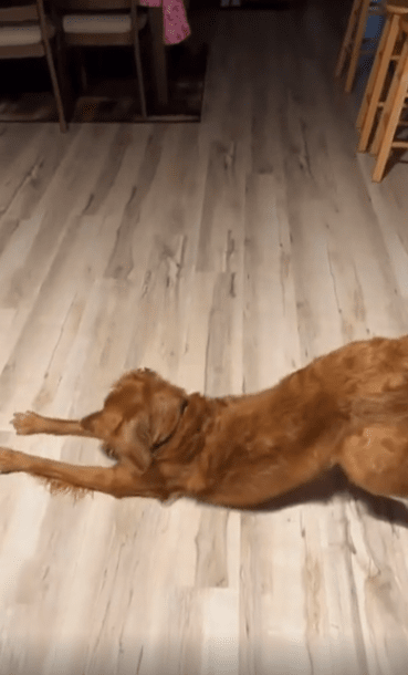 잠시 얼음을 바라보던 강아지는 망설임 없이 다가가더니, 그 위에 몸을 착— 덮어버립니다. 머리부터 배까지, 몸을 쭉 뻗은 채 바닥에 깔린 얼음 위로 정확히 눕는 이 자세는 마치 냉찜질을 오랜 시간 기다렸다는 듯한 숙련된 움직임입니다. 다리도 힘을 뺀 채 길게 뻗고, 턱은 바닥에 살짝 붙이며, 입가엔 아주 미묘한 만족감이 흐릅니다.