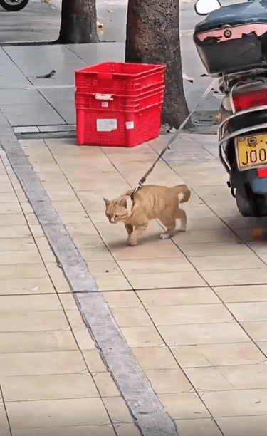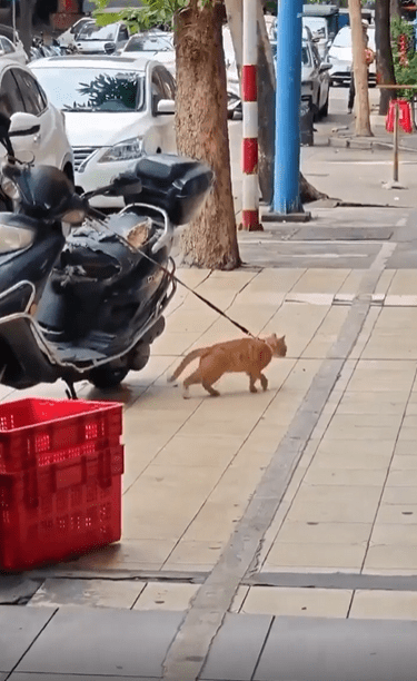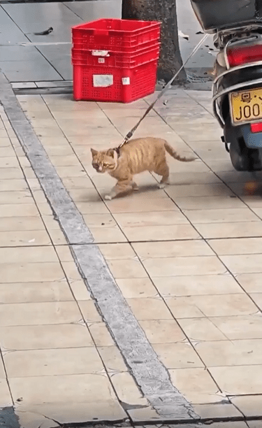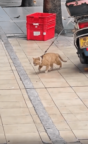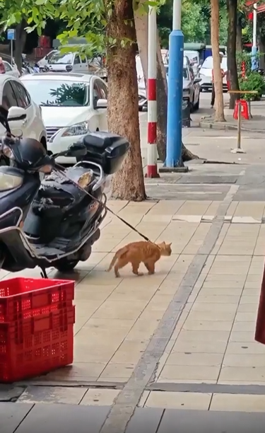 고양이의 발바닥은 땅 위를 바쁘게 움직이고 있지만, 줄이 팽팽하게 당겨지는 바람에 몸은 오토바이 옆에 그대로 멈춘 상태입니다. 그럼에도 고양이는 ‘내가 멈춘 게 아니야. 세상이 안 움직이는 거야’라는 듯, 고개를 휘젓지도 않고 방향을 바꾸지도 않은 채 묵묵히 걸음을 이어갑니다. 그 모습은 웃음을 자아내는 동시에, 왠지 모르게 응원하고 싶어지게 만듭니다.