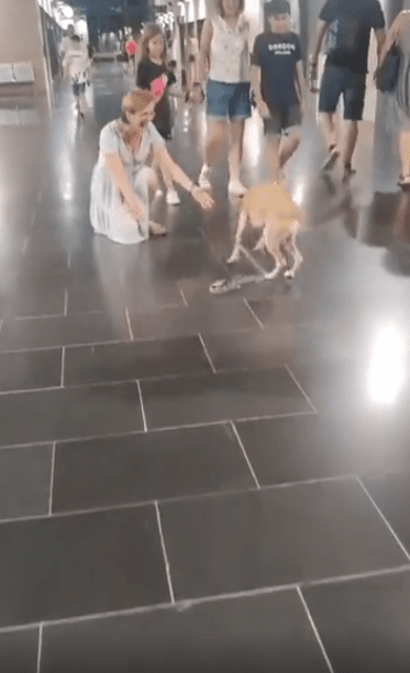 넓고 깔끔한 실내 복도. 차분한 배경 속, 강아지의 시선이 그쪽으로 꽂히자마자, 온몸이 바쁘게 움직이기 시작합니다. 화면 속 여성이 두 팔을 앞으로 벌리고 무릎을 굽힌 채 “와봐!” 하듯 반가운 몸짓을 보이자, 강아지는 더 이상 가만히 있을 수 없습니다. 작은 발로 바닥을 동동 구르며 기쁨을 주체하지 못한 채 그 자리에 펄쩍펄쩍 뜁니다.