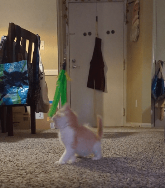 이제는 온몸이 함께 움직입니다. 뒷다리를 살짝 구부린 채 점프하고, 착지한 뒤엔 다시 등을 둥글게 말아 재차 달려들 준비를 합니다. 작은 숨소리와 함께 반복되는 움직임 속엔, 놀이를 배우는 아기 고양이의 설렘과 집중이 고스란히 담겨 있습니다. 그저 장난감을 건드리는 것뿐이지만, 그 속에는 ‘처음 무언가를 알아가는 생명체’의 순수한 감정이 녹아 있지요.